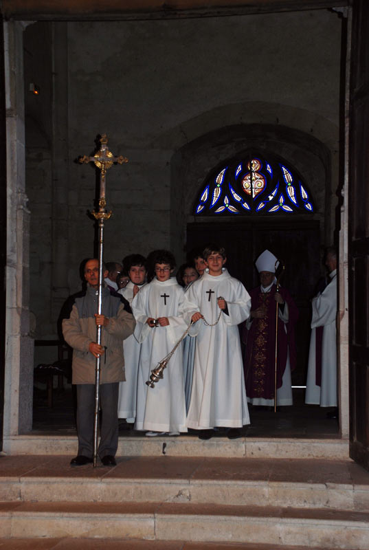 Monseigneur Aillet et les servants d'autel se préparent avant la messe |