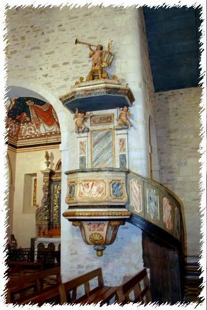 Une autre curiosité, le plafond peint sur bois de l’autel de la Vierge, il est daté de 1757. photo de droite la chaire |