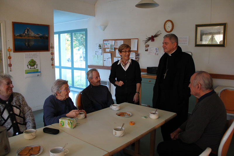 | Puis c'est la visite à la Roussane... | ... la maison de retraite de Monein... | ... Mgr Aillet discute avec les résidents... | ... les accompagnateurs aussi... |