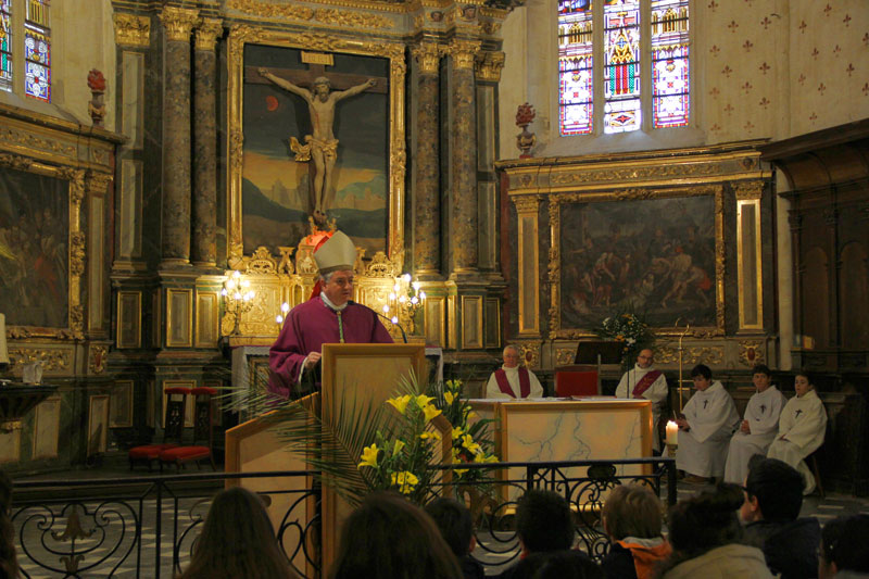 | 11h le début de la messe dans une église bien pleine... | ... bien à l'écoute de notre évêque, ... | ...les servants d'autels à leur poste... | ...Mgr Aillet à salué tout le monde à la sortie. |